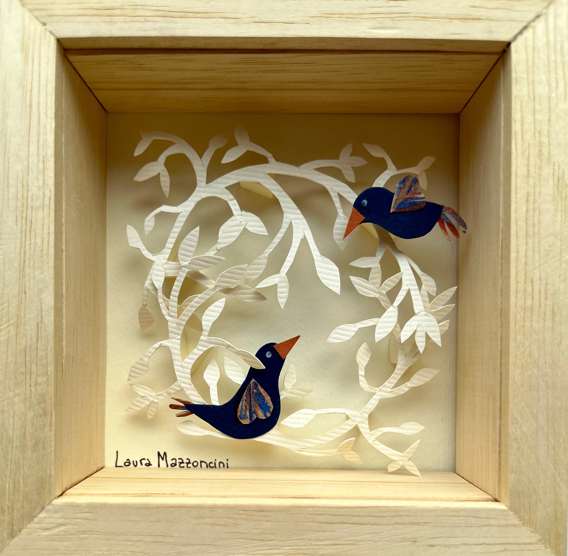 CUADRO PÁJAROS MIRÁNDOSE CON NIDO, Enmarcado en varilla de Marupá.