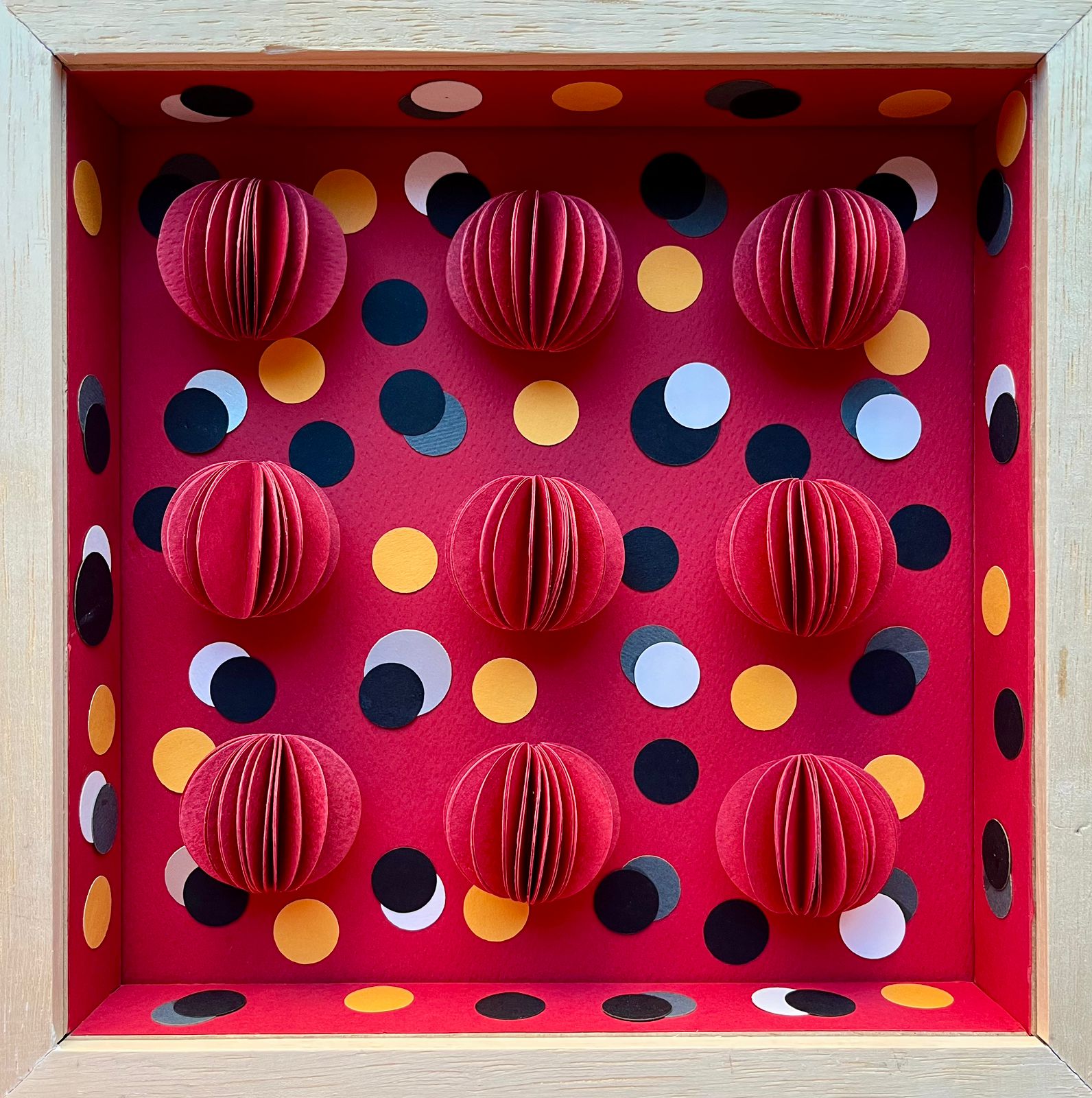 CUADRO CÍRCULOS ROJOS PLEGADOS, Enmarcado en varilla de Marupá.